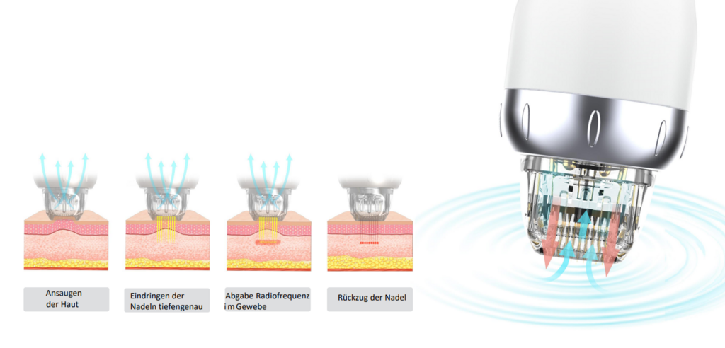 RF bewirkt die Kontraktion der vorhandenen Kollagenfasern, fördert die Fibroblastenmigration und das Wachstum von neuem Kollagen, wodurch die äußere Struktur der Haut gestrafft wird. RF funktioniert durch Radiowellenströme, die tief in die Dermis und in die subkutanen Schichten der Haut eindringen, was zu einer Straffung des darüber liegenden Gewebes führt. Das Erscheinungsbild der Haut wird verbessert.